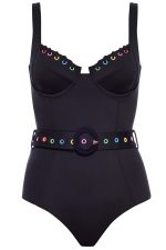This colorful one-piece features a removable belt and vintage-inspired silhouette with underwire cups for support. Crafted with sustainable fabric from