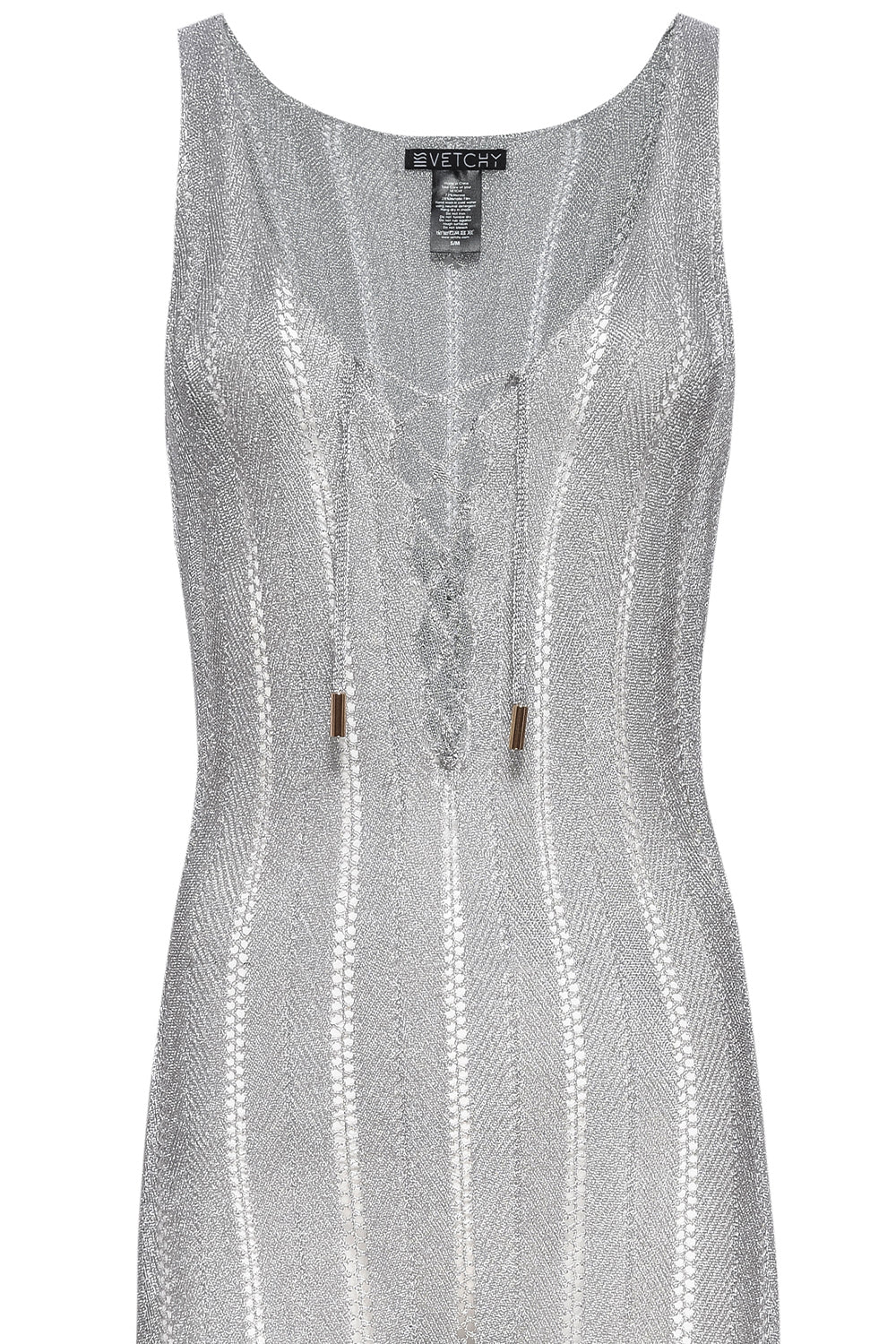 Gorgeous metallic yarn dress with lace front detail. Model is 5’7″, bra size 32C and is wearing a size S/M.
