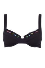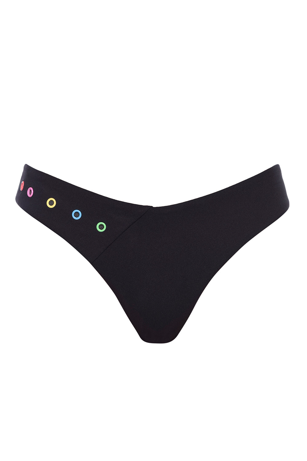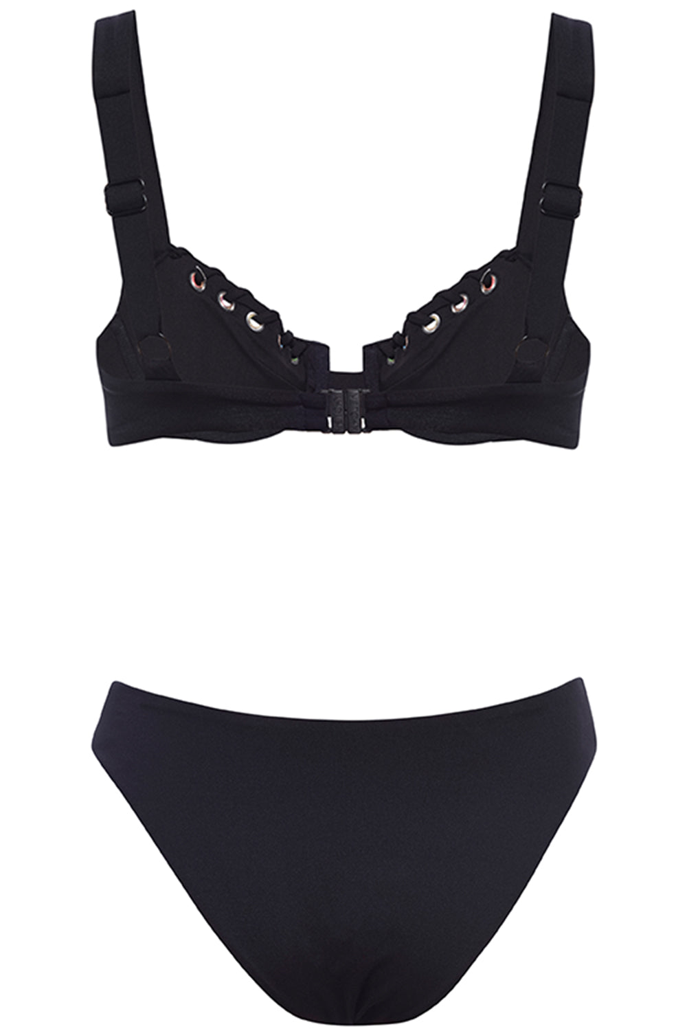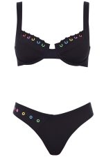 Our signature Laguna Bikini in black with beautiful details. Made with High-Stretch Firm Hold Spandex. Comfortable bikini bottoms that won’t dig into your skin. Includes removable pads for extra lift and shape.