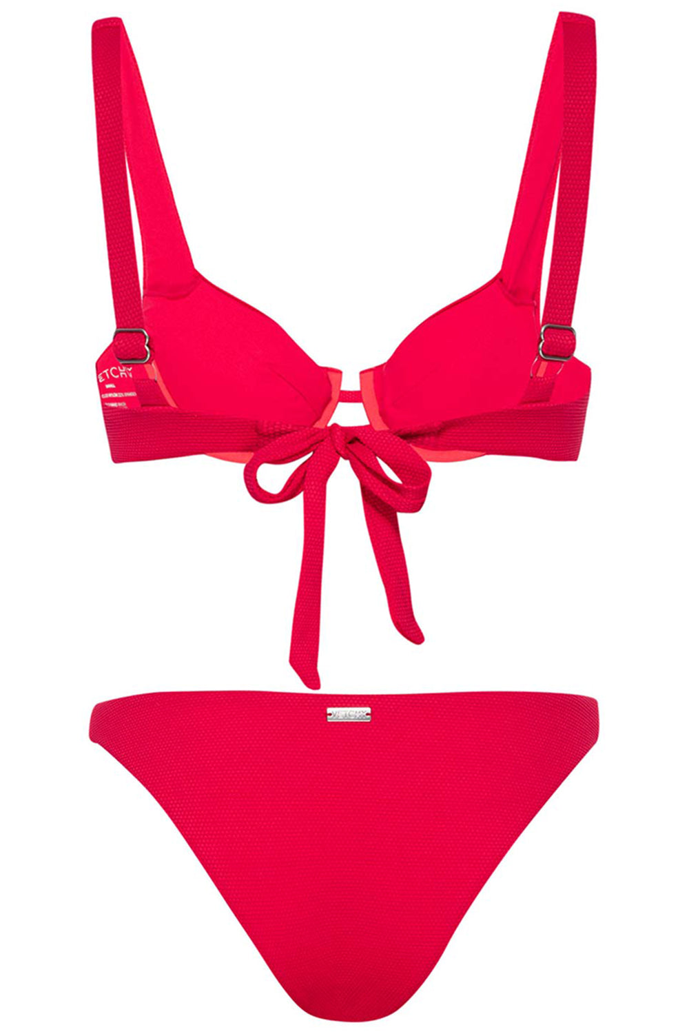 Featuring a tie back design with adjustable straps and underwire support. Comes with removable pads. Comfortable bikini bottoms that won’t dig into your skin. Cheeky bottoms. Made with luxurious textured fabric from Italian Carvico®